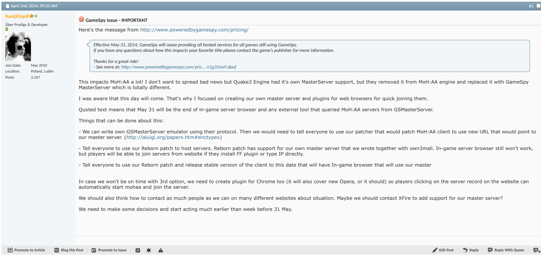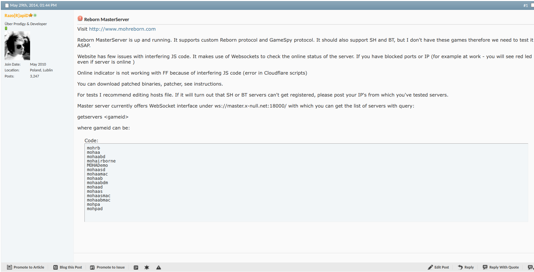 Later on we've added GameSpy protocol support. This work has been crucial in keeping the game alive.